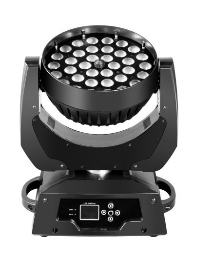 La luce da palcoscenico a testa mobile con zoom è costruita con LED RGBW 4-in-1 da 36x10 W per produrre fasci colorati e una varietà di effetti luminosi, perfetti per l'illuminazione del palcoscenico.