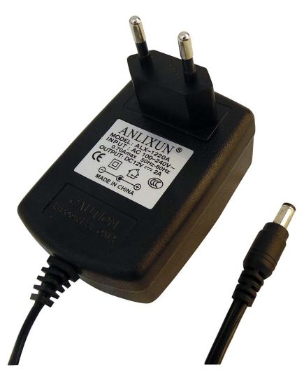 Alimentatore switching con 12 VCC/2A di uscita, adatto per dispositivi e apparecchiature alimentate a 12V e telecamere.